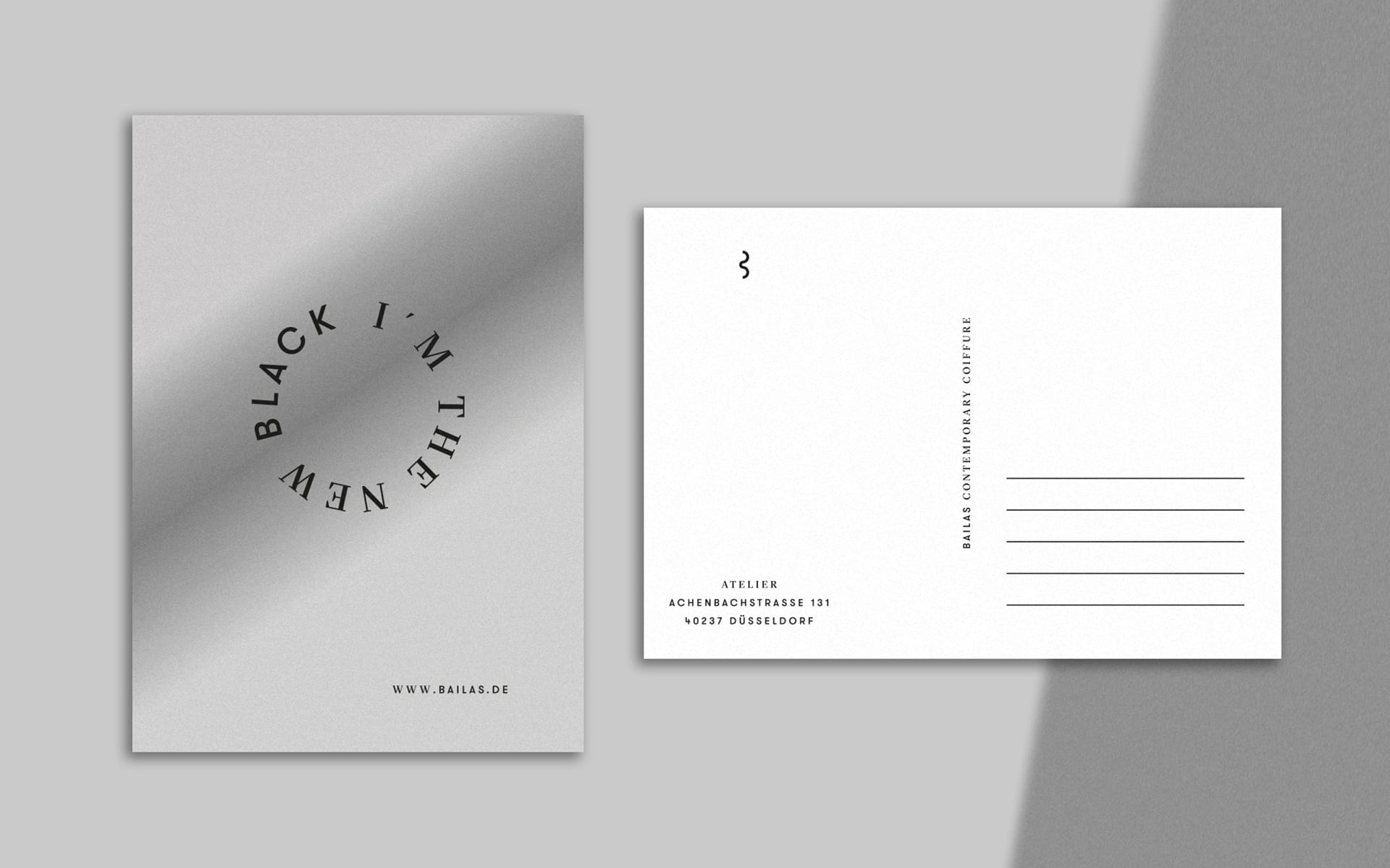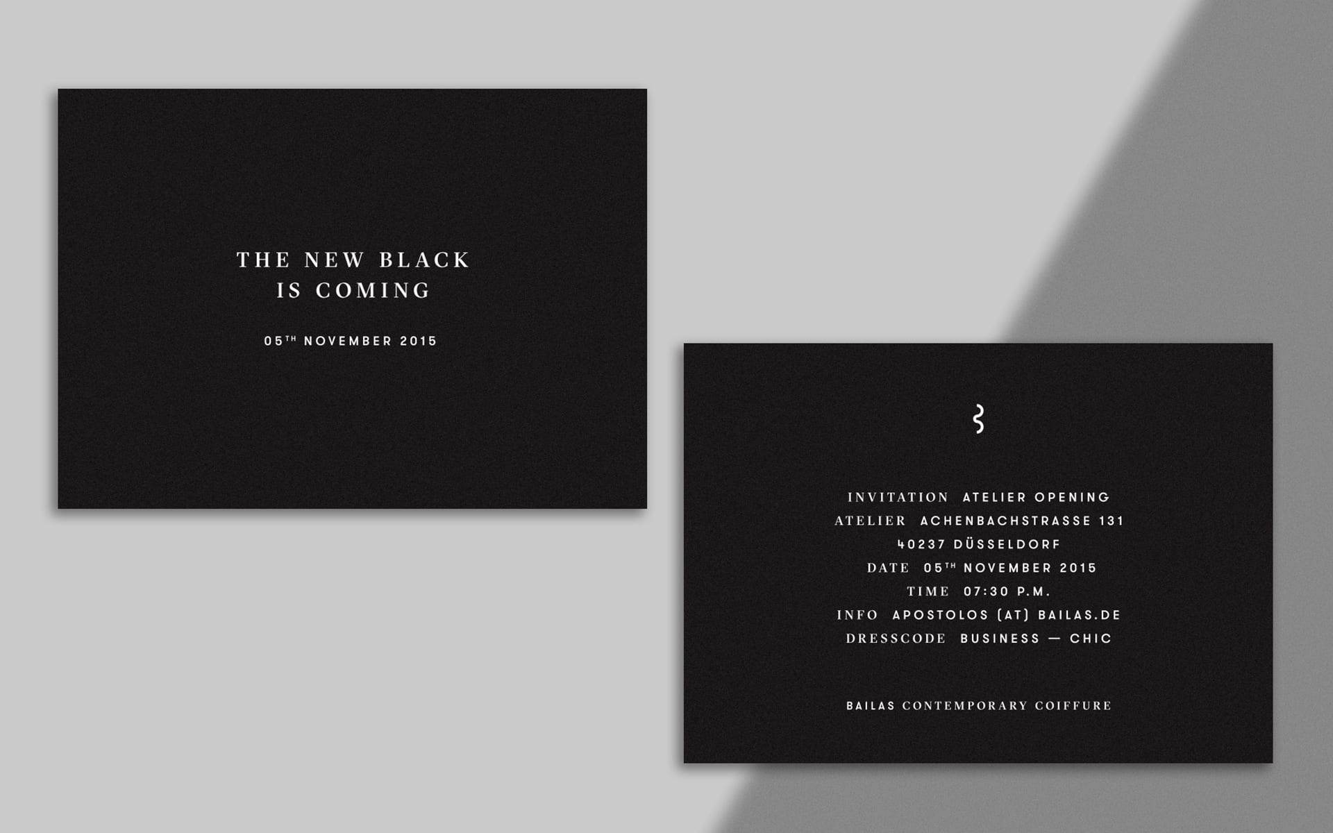 Mit der sowohl einfachen als auch zentralen Botschaft „The new black is coming“ startet die Einführungskampagne als Fensterbeklebung des neuen Ateliers zu Beginn der Umbauphase. Mit der sukzessiven Ausweitung auf weitere Kommunikationsmittel erzeugt die Kampagne vor allem Spannung und macht die relevante Zielgruppe vor Ort auf die neue Marke und das Atelier aufmerksam. Pünktlich zur Eröffnung ändert sich die Botschaft auf „I’m the new black“, um auf die Markenbotschaft von Bailas CC überzuleiten.
