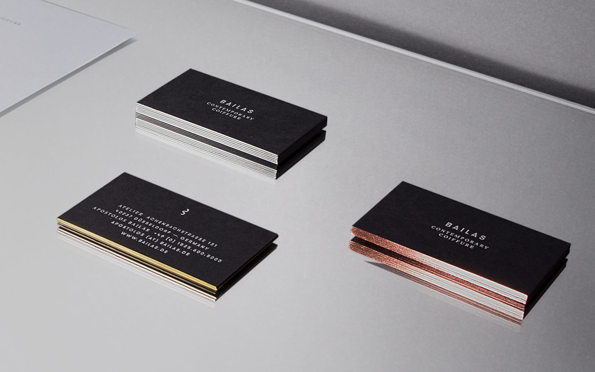 Das Corporate Design zeichnet sich durch die Kombination von klarer, minimaler Gestaltung und der Verwendung von hochwertigen Materialien mit exklusiven Veredelungen aus. Durch verschiedenfarbige Folienschnitte entstehen Visitenkarten, die je nach Haarfarbe des Empfängers ausgewählt werden können.