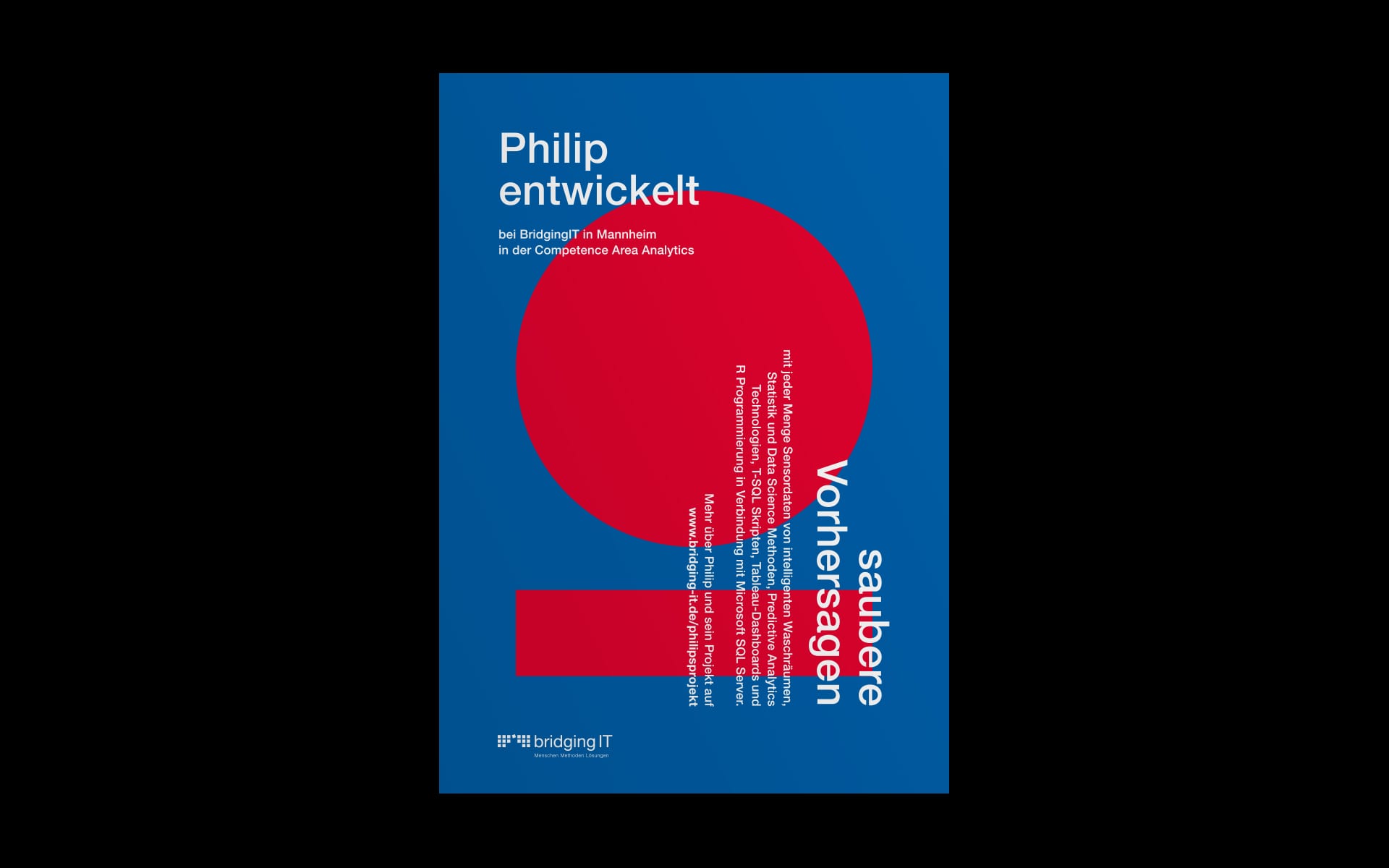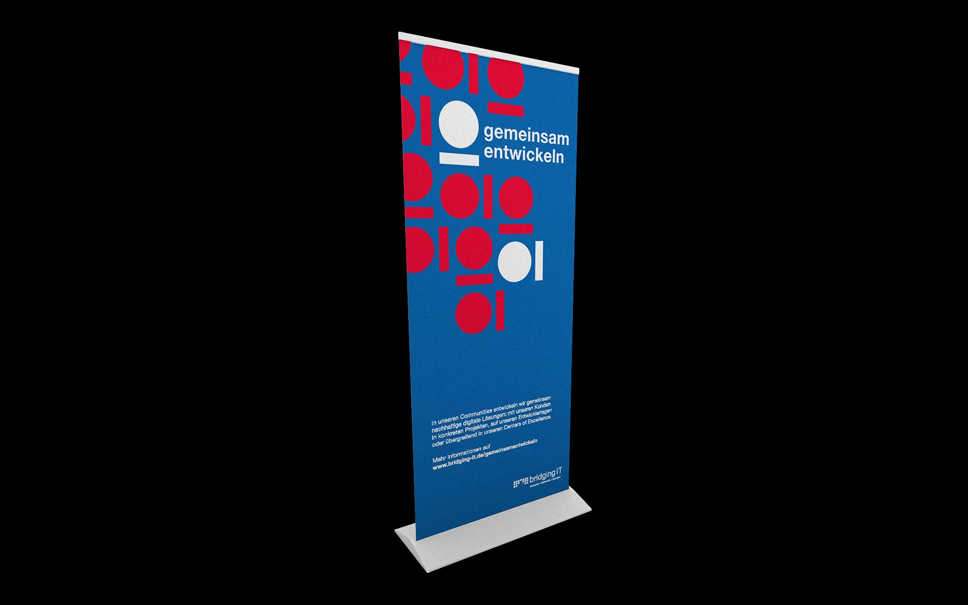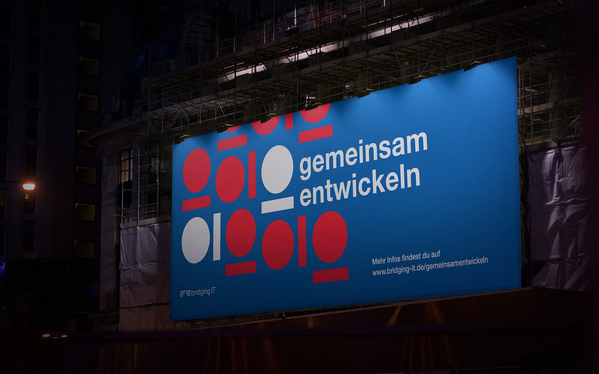 Auf Basis einer qualitativ durchgeführten Analyse wurde deutlich, dass die inhaltliche Projektarbeit im Team das zentrale Element darstellt und BRIDGING IT von aktuellen Mitarbeitern aus diesem Grund als Arbeitgeber anderen potenziellen Wettbewerbern vorgezogen wurde. Dementsprechend werden die Person und das Projekt in einem übergreifenden Konzept in den Fokus gerückt. Das entwickelte Symbol visualisiert je nach Perspektive den Menschen oder lässt einen Binärcode erkennen, der sinnbildlich für die digitale Welt steht. Über das Visuelle hinaus, fasst ein Claim die zentrale Botschaft so einfach wie möglich zusammen und dient als Absender für Arbeitgeberthemen: GEMEINSAM ENTWICKELN.