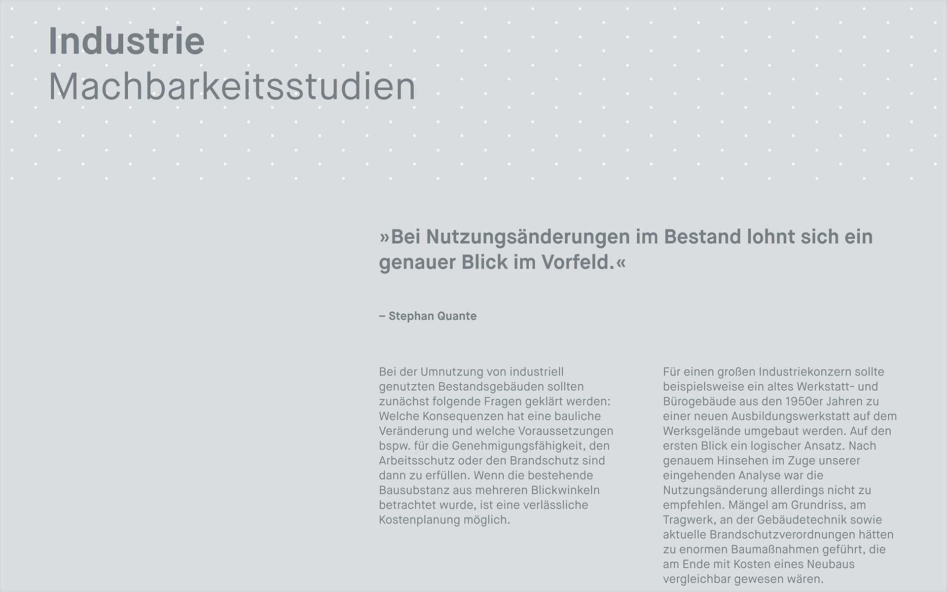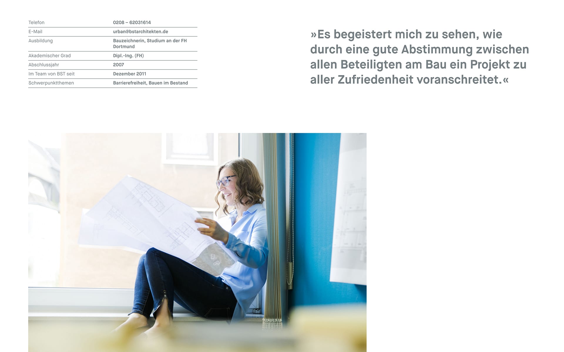 The contemporary website presents various content topics in a clear and varied manner with the help of the minimalist design. The topic of the different points of view is taken up again with detailed process descriptions, matching project examples as well as personal statements of the BST team.