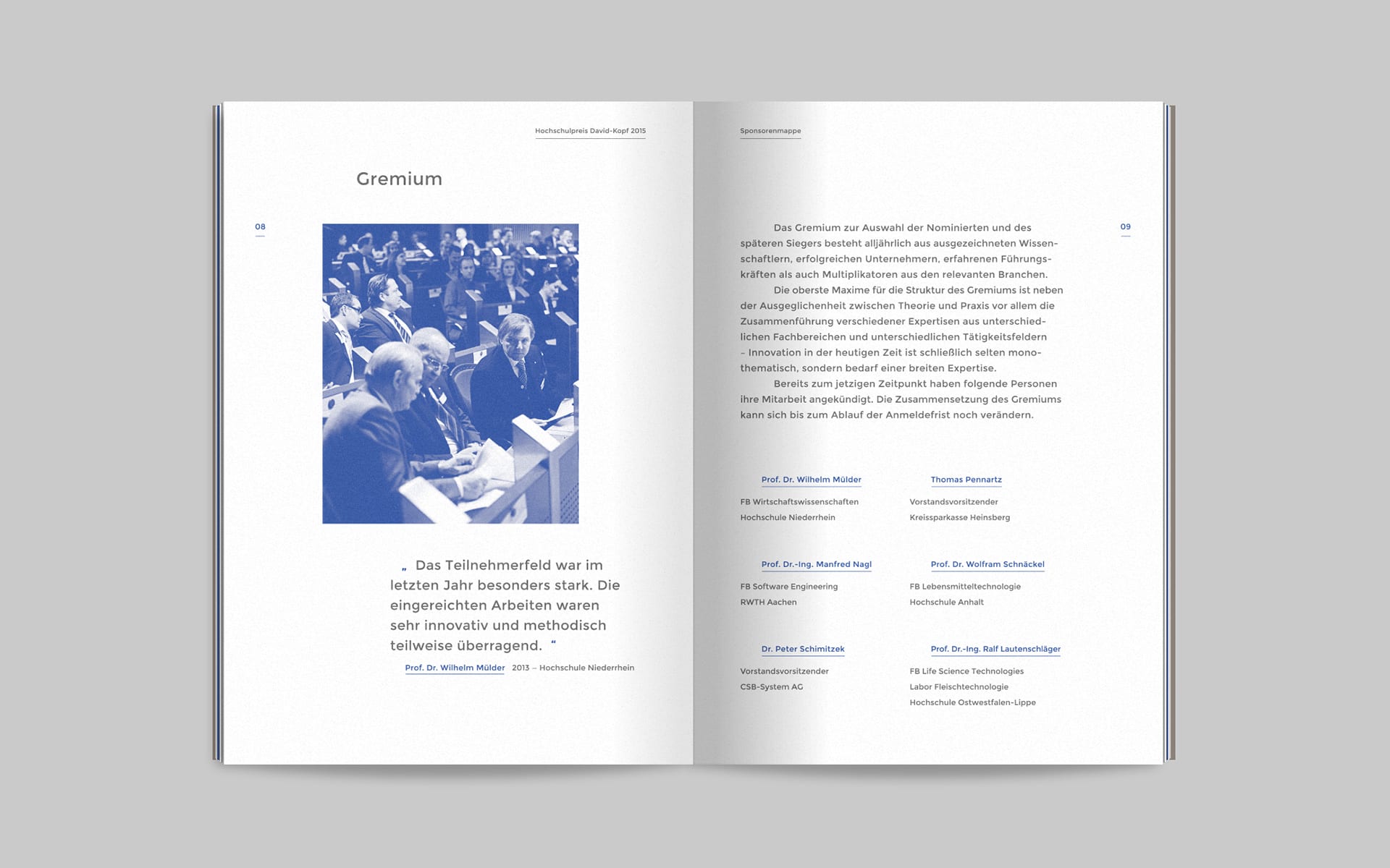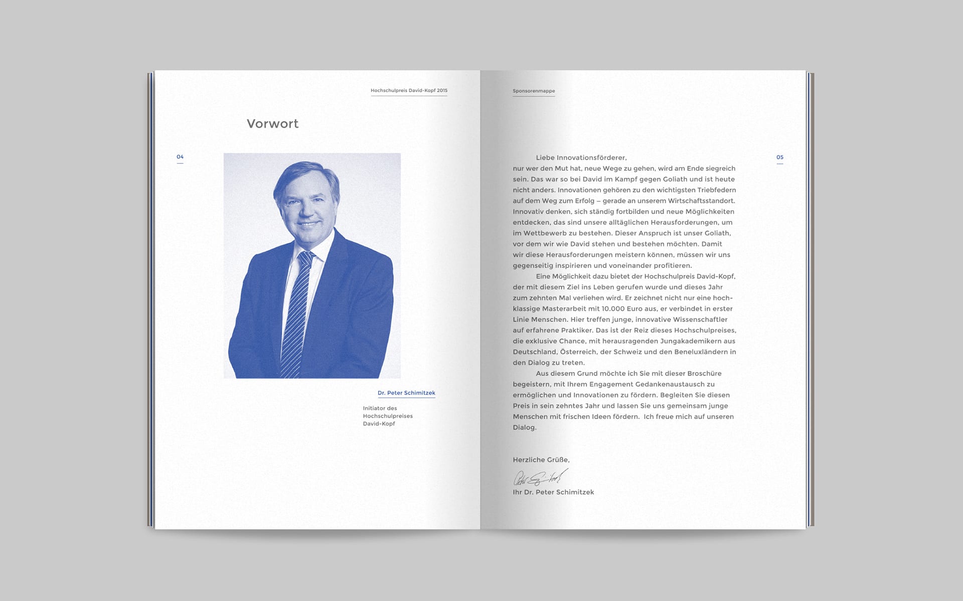 For David, the immediate confrontation with Goliath begins with the momentum of the slingshot; the same happens with the same momentum when opening the mailing. After opening the specially designed envelope, the brochure is revealed, which the recipients of the mailing are asked to take a closer look at in order to learn more about the university prize, its orientation and individual sponsoring activities. The headline system on the envelope and brochure title also makes it clear that the mythological basis of the communication concept is closely linked to the CSB-System AG University Award.