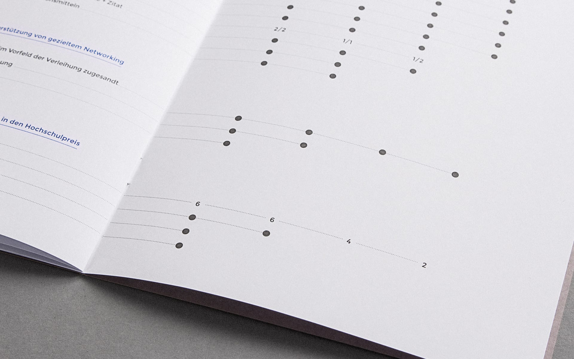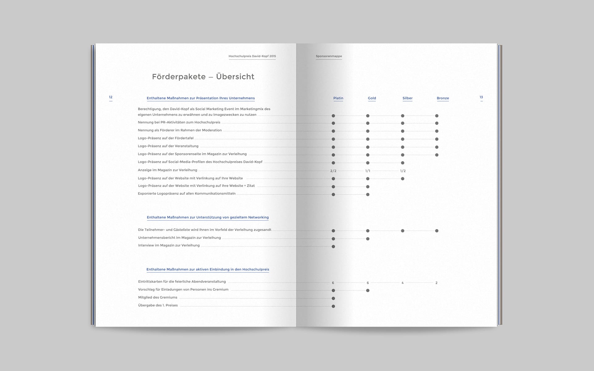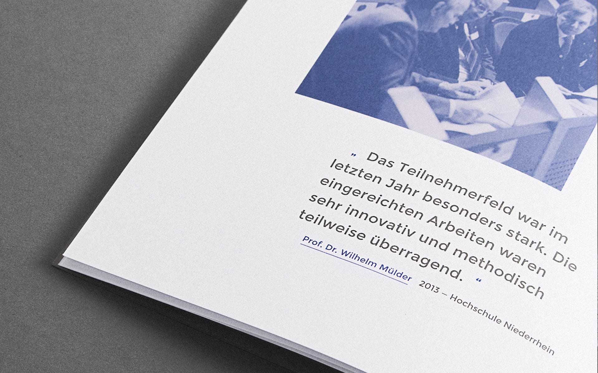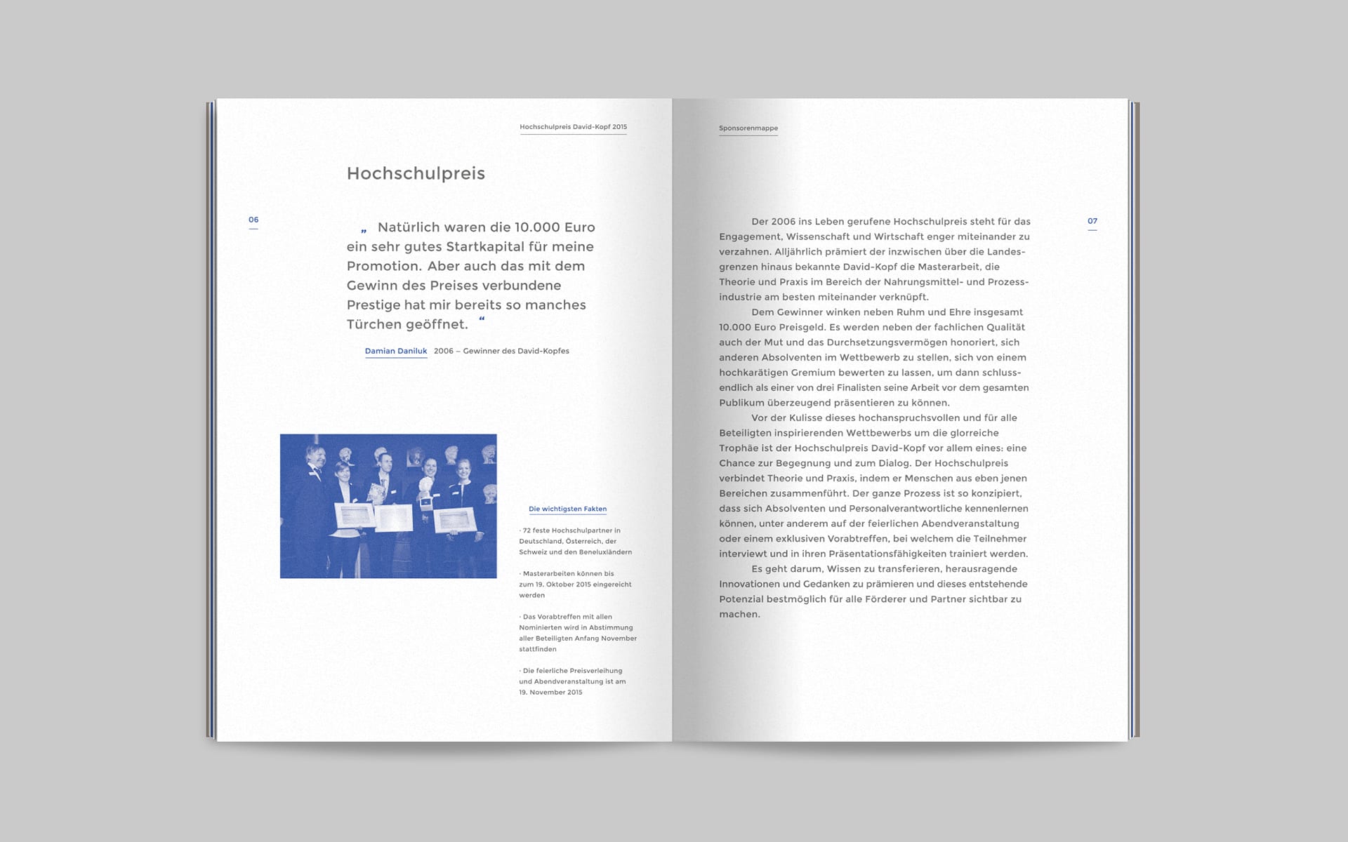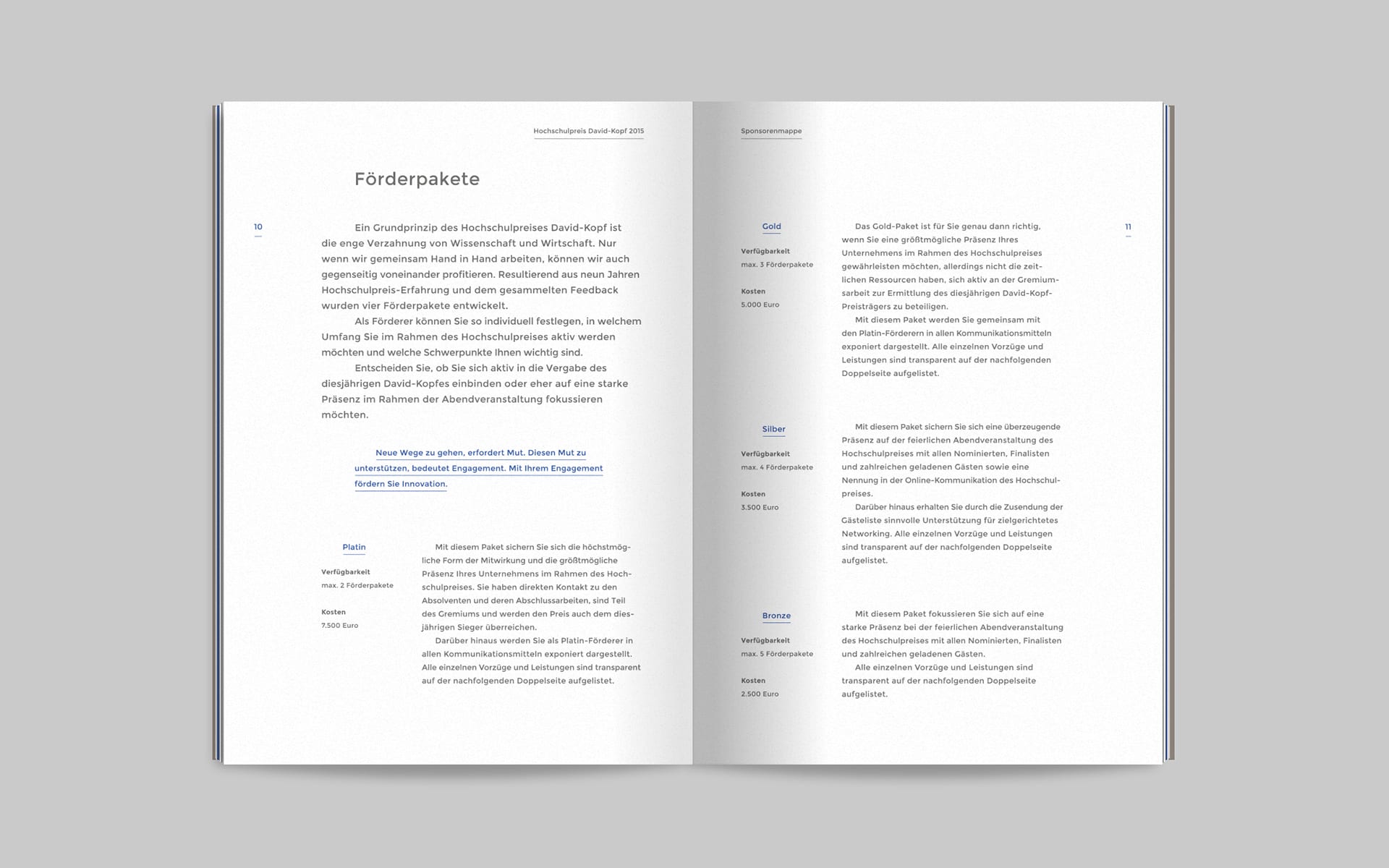 For David, the immediate confrontation with Goliath begins with the momentum of the slingshot; the same happens with the same momentum when opening the mailing. After opening the specially designed envelope, the brochure is revealed, which the recipients of the mailing are asked to take a closer look at in order to learn more about the university prize, its focus and individual sponsoring activities. The headline system on the envelope and brochure title also makes it clear that the mythological basis of the communication concept is closely linked to the CSB-System AG University Award.