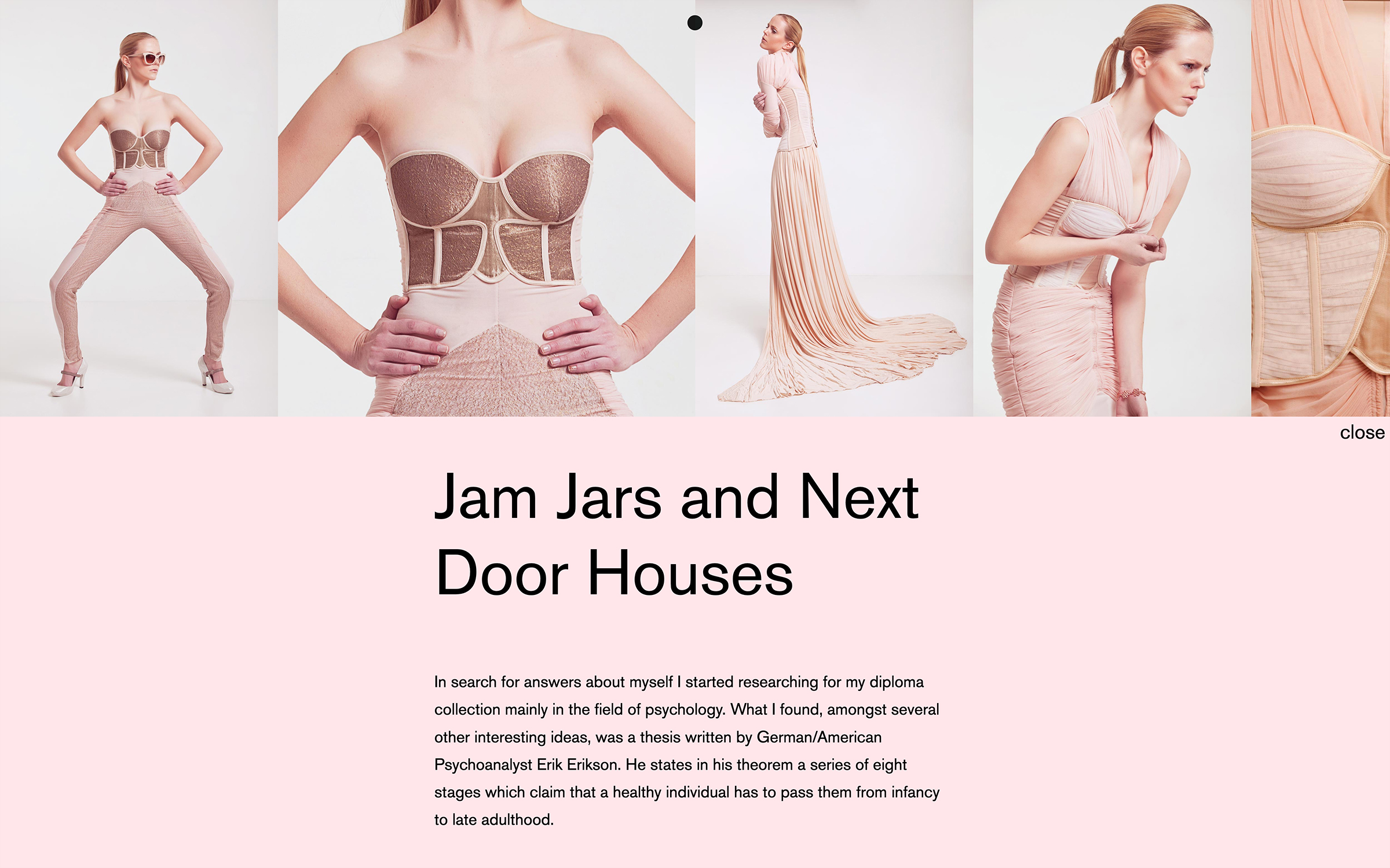 The website puts the brand story "STELLA CREATES" in the absolute focus of perception through the reduced menu with only two navigation points. The two menu items conceal information about the designer Stella Achenbach or her portfolio of realised projects. The creation and inspiration process is emphasised once again at project level by the split screen used: in addition to the final design objects, it also provides a glimpse behind the scenes and presents the story of Stella's creation as well as her sources of inspiration.