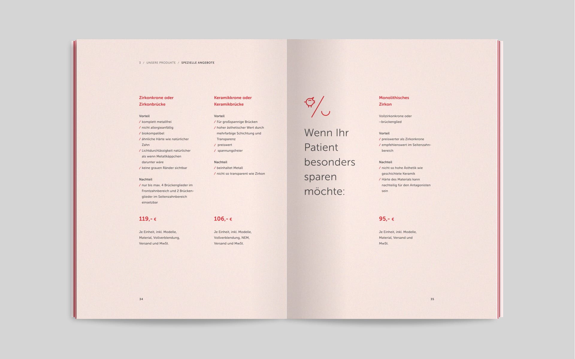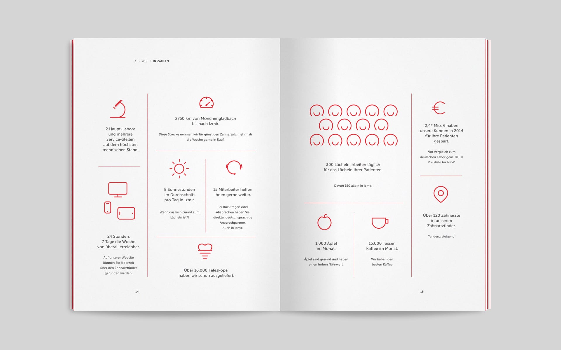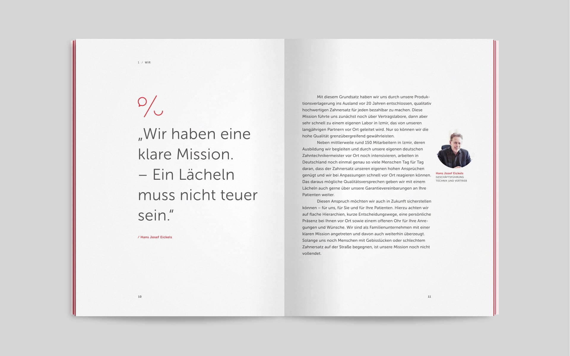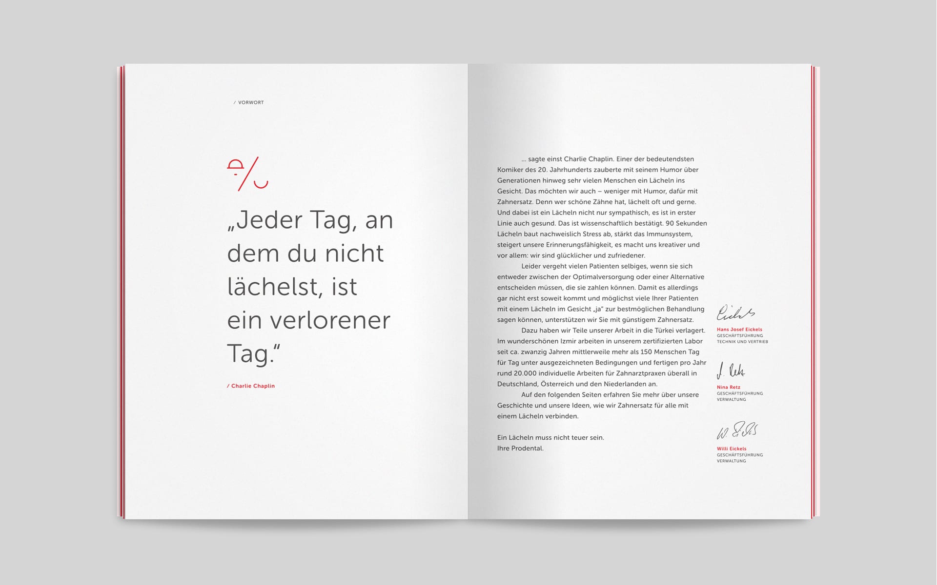 Entlang der einzelnen Themen und Leistungen wird die konzipierte Story um die Markenwerte von Prodental und dem Unternehmensclaim „Ein Lächeln muss nicht teuer sein“ angemessen erzählt und speziell auf die Zielgruppe „Zahnärzte“ ausgerichtet. Die individuell gestalteten dynamischen Icons, die auf Basis des Unternehmenslogos entwickelt wurden, verknüpfen die Geschichte auf visueller Ebene und unterstützen somit das Storytelling auf den einzelnen Seiten der Broschüre.