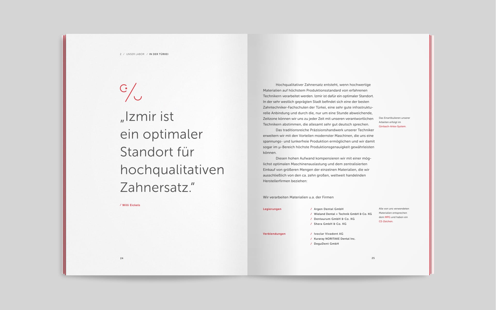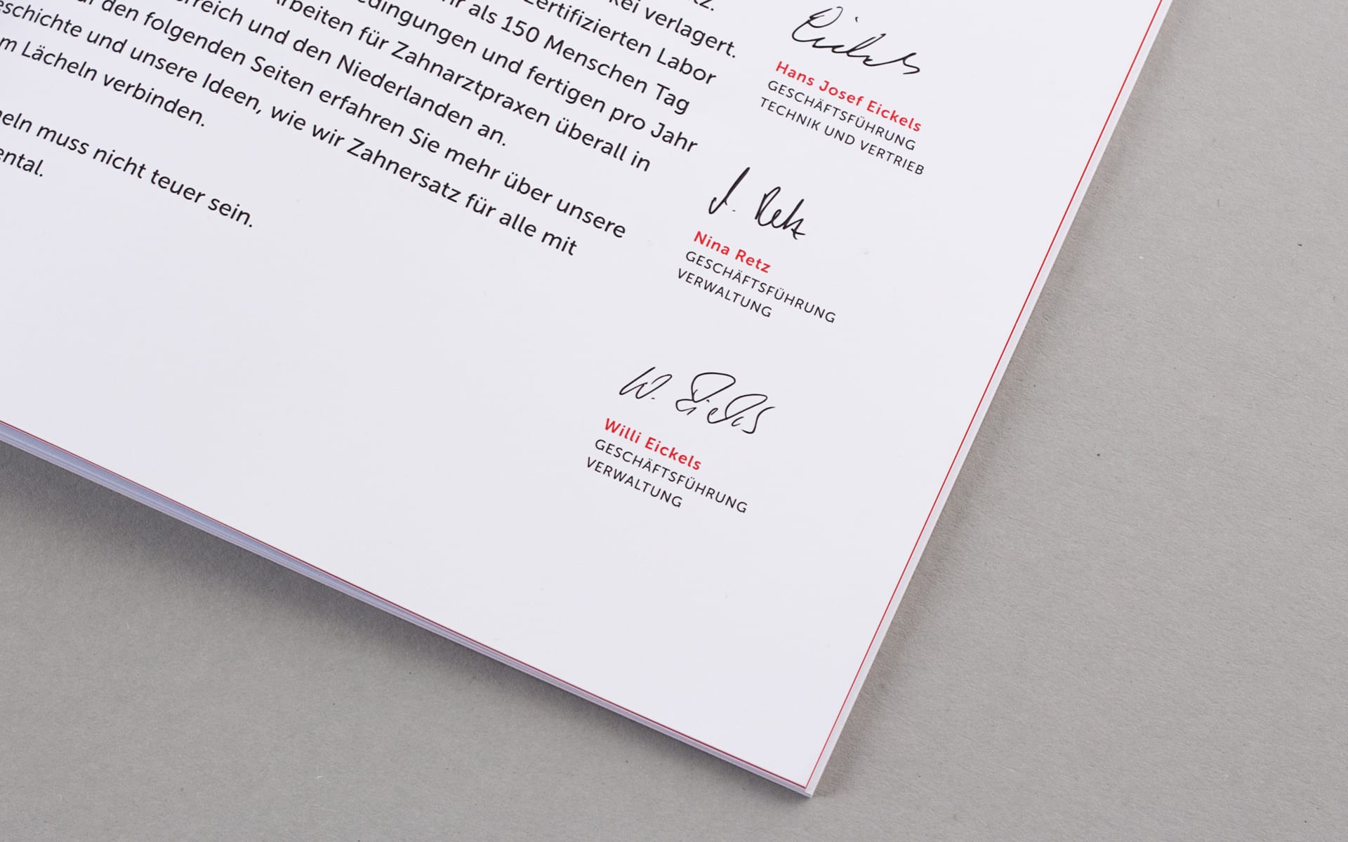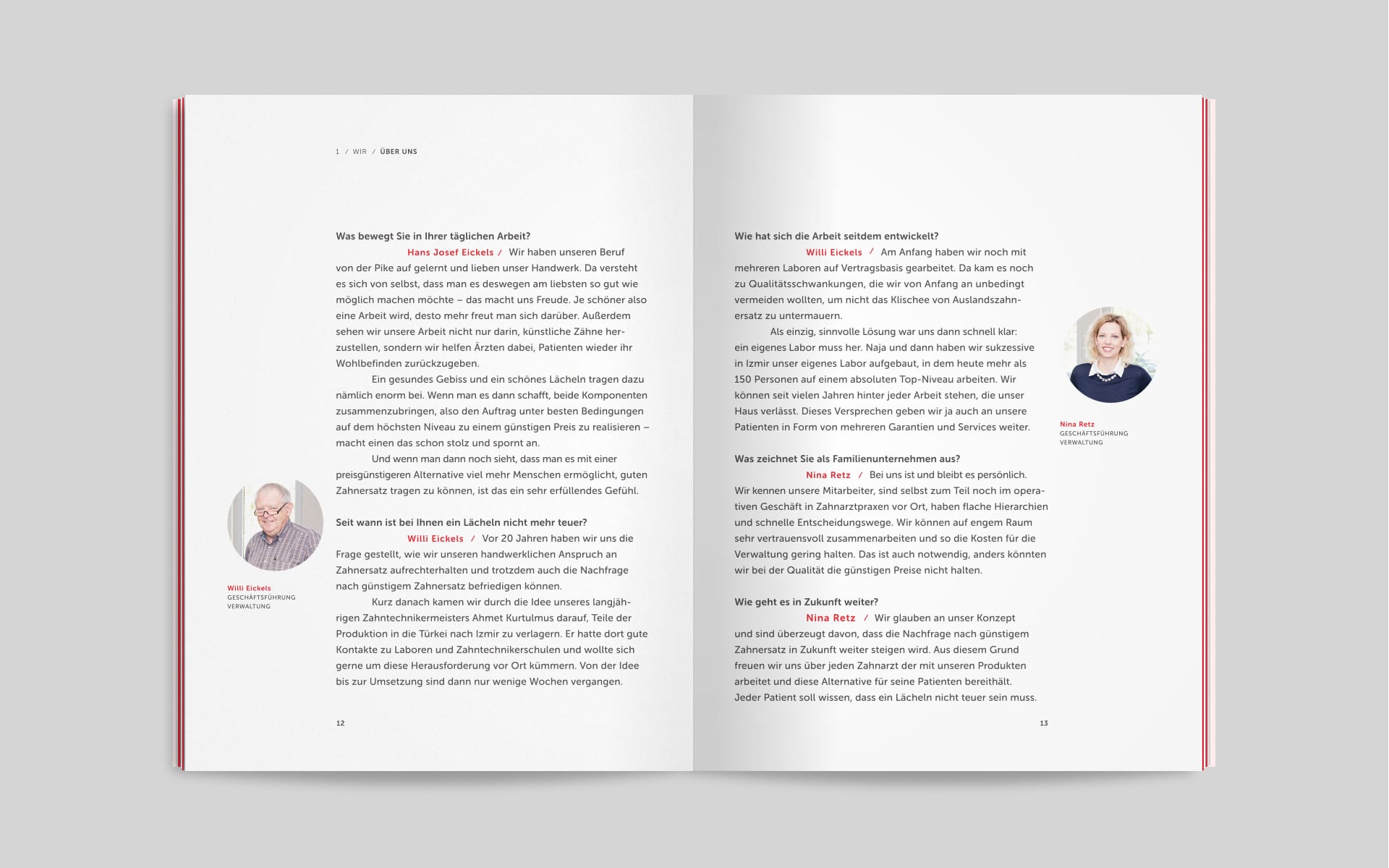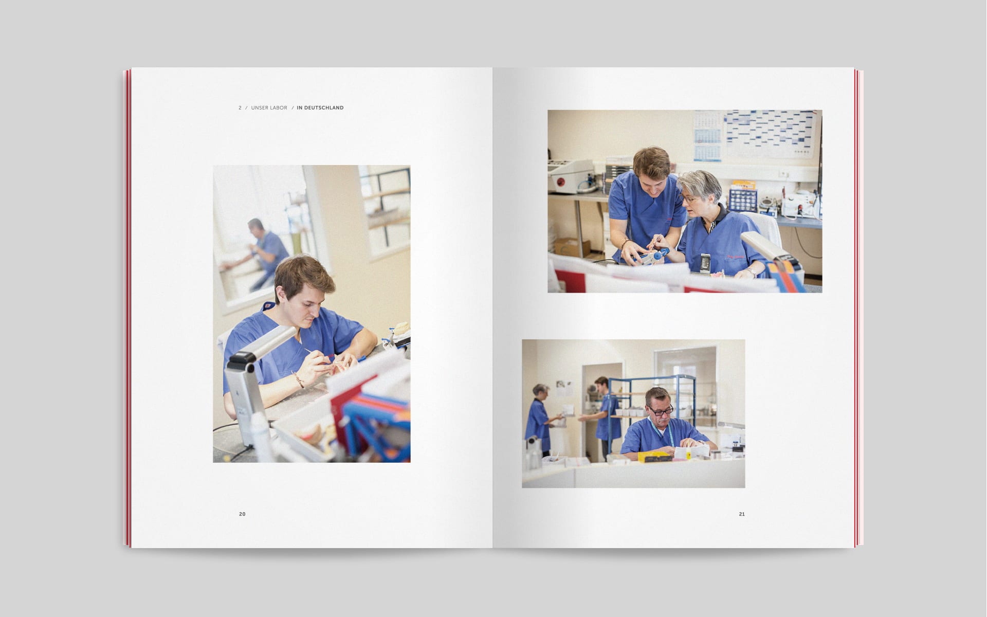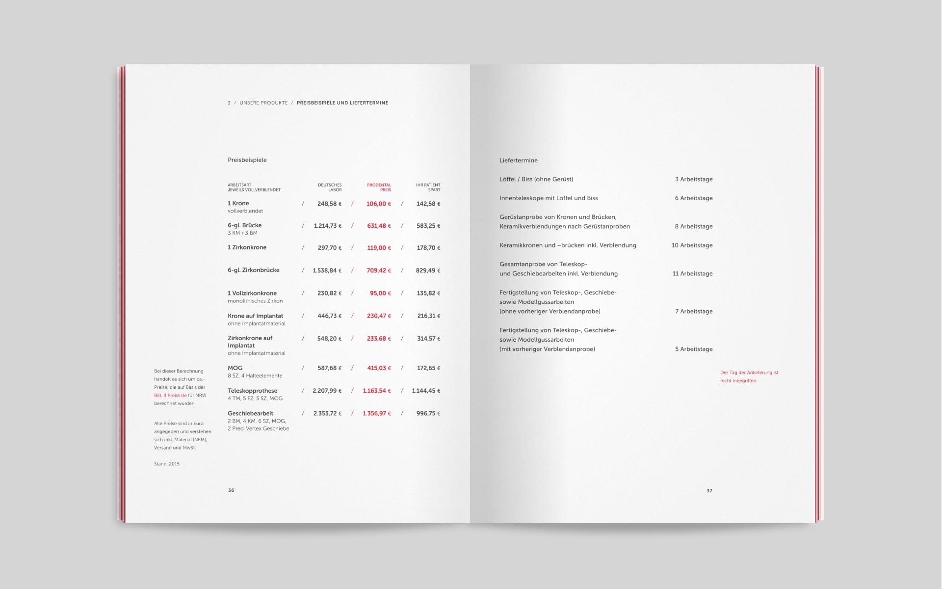 Entlang der einzelnen Themen und Leistungen wird die konzipierte Story um die Markenwerte von Prodental und dem Unternehmensclaim „Ein Lächeln muss nicht teuer sein“ angemessen erzählt und speziell auf die Zielgruppe „Zahnärzte“ ausgerichtet. Die individuell gestalteten dynamischen Icons, die auf Basis des Unternehmenslogos entwickelt wurden, verknüpfen die Geschichte auf visueller Ebene und unterstützen somit das Storytelling auf den einzelnen Seiten der Broschüre.